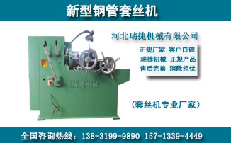 瑞捷套絲機設備采用液壓裝置成功解決勞動強度大,效率低,且無定位裝置,絲扣長短難控制等弊端,可一次型完成螺紋加工成型且螺紋牙形飽滿光滑。套絲機的主要部件及結(jié)構(gòu)是由套絲機床的傳動系統(tǒng),支架系統(tǒng),切線板牙頭,定位裝置及液壓系統(tǒng)組成,工作時只要將工件裝入夾鉗,其余程序?qū)⒆詣油瓿桑僮骱唵危ㄋ滓锥鸾萏捉z機廠家直銷,質(zhì)量有保證,減少不必要的中間環(huán)節(jié),為客戶帶來實實在在的優(yōu)惠政策,歡迎新老客戶洽談合作事宜和來電咨詢.