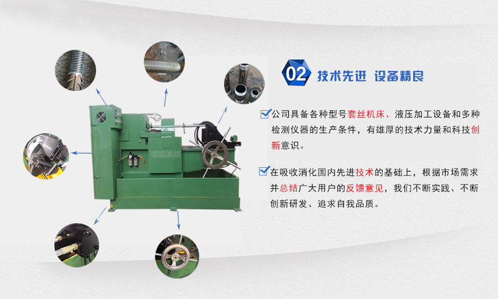 瑞捷套絲機設備采用液壓裝置成功解決勞動強度大,效率低,且無定位裝置,絲扣長短難控制等弊端,可一次型完成螺紋加工成型且螺紋牙形飽滿光滑。套絲機的主要部件及結(jié)構(gòu)是由套絲機床的傳動系統(tǒng),支架系統(tǒng),切線板牙頭,定位裝置及液壓系統(tǒng)組成,工作時只要將工件裝入夾鉗,其余程序?qū)⒆詣油瓿桑僮骱唵危ㄋ滓锥鸾萏捉z機廠家直銷,質(zhì)量有保證,減少不必要的中間環(huán)節(jié),為客戶帶來實實在在的優(yōu)惠政策,歡迎新老客戶洽談合作事宜和來電咨詢.
